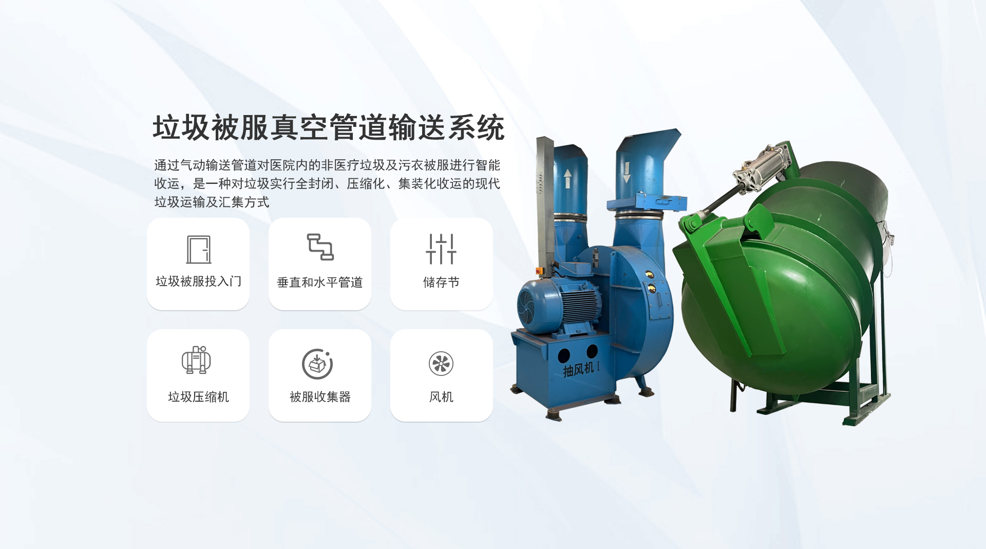 系統(tǒng)簡(jiǎn)介:通過(guò)氣力式輸送管道對(duì)醫(yī)院內(nèi)的垃圾和污衣被服進(jìn)行收集,是一種對(duì)垃圾實(shí)行全封閉、壓縮化、集裝化收運(yùn)的現(xiàn)代垃圾運(yùn)輸及匯集方式...